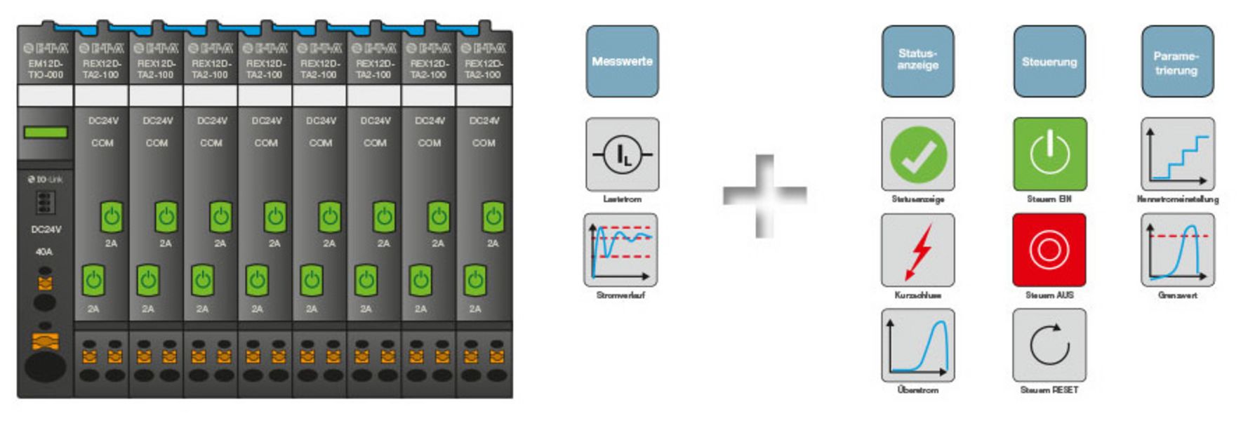 The REX12D intelligent system is ideally adapted to the requirements of machine construction and process control. The compact and modular design, the innovative connection technology and the great number of different devices provide a competitive edge over standard solutions to protect your DC 24 V power distribution.